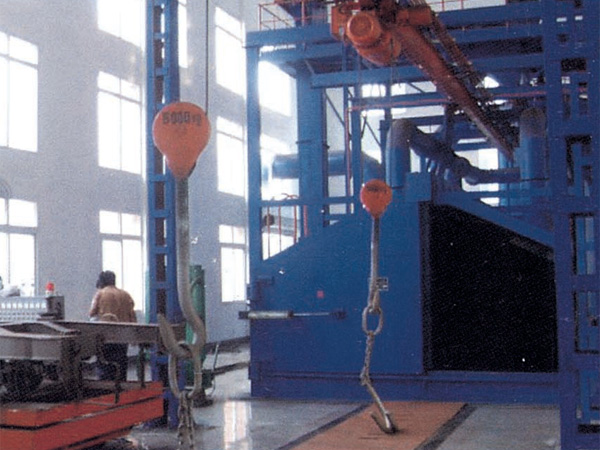 吊钩通过式抛丸机可用于对机械制造.压力容器.汽车.船舶.建筑.电机.机床等行业的大中型铸锻件.钢结构件进行表面清理或强化,用于提高产品零部件的外观质量和表面工艺状态。对于可以吊挂的大型工件,可以采用双电动葫芦抬起工件通过抛丸区.对工件进行抛丸清理,多台抛丸器经电脑模拟布置.可以对工件的各个表面彻底的进行清理。以达到清除钢结构锈蚀、旧漆皮及其它污物的目的。专用技术的室体防护和密封结构,使本机具有结构先进、生产效率高.清理质量好及自动化程度高的特点。