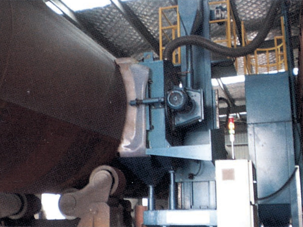 内壁抛丸小车在横梁上进行抛丸的同时,也在横梁上行走,行走是变频调速的,被打完的塔筒表面呈现一定宽度宽的环形螺旋状的银白色条带,将小车的行走速度与塔筒的转速进行相配合,使之相邻的银白色条带相互重合,可使塔筒表面无任何遗漏。钢管打砂的方式可以改变为:在打砂的过程中,打砂小车不同时移动,打完一圈后,在移动一个工作位置,再打一圈。直至将钢管内壁打完。