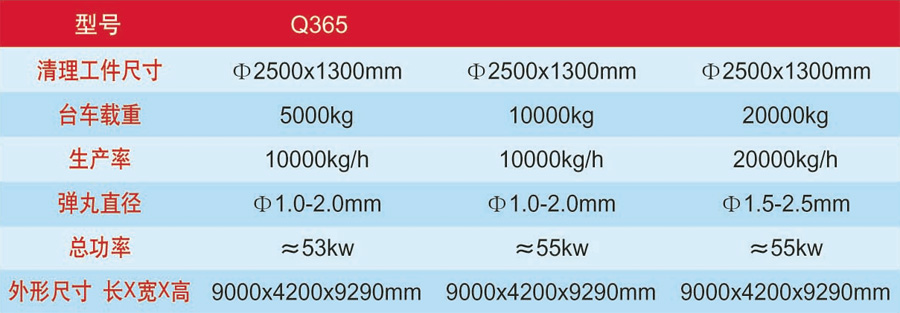 台车式抛喷丸清理机适用于大中型钢结构件和铸件的表面清理和强化,亦适用于厚钢坯的表面除锈及表面氧化皮的清理,广泛用于铸造、锻压、机械钢铁等行业。台车不但可承载工件而且可自转,工件可得到全面有效的清理,只需一个清理室,对于结构比较复杂的工件,抛丸后的死角可通过手动喷丸补充清理,使工件清理彻底。