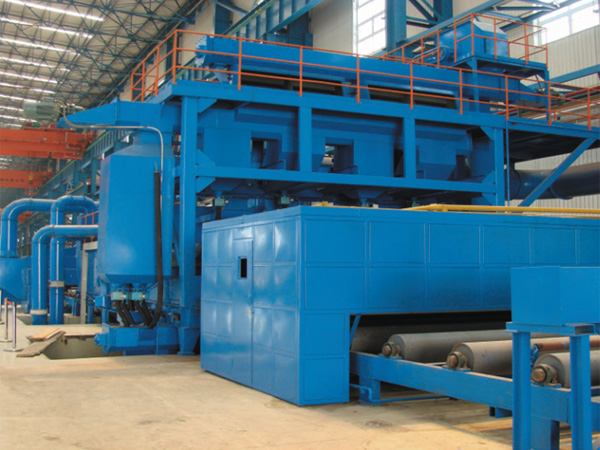 本设备为高效率连续作业钢材预处理生产线。钢材通过辊道经预热后送进抛丸清理室,多台不同坐标方位的高效抛丸器利用弹丸对其进行强力密集的打击与摩擦,使其表面上的氧化皮、锈斑及污物迅速脱落,钢材表面得到清理和强化。在抛丸过程中,撒落下来的丸尘混合物经室体漏斗及纵横向螺旋输送机汇集于提升机下部,再提升到机器上部的分离器进行丸尘分离,分离后的弹丸落入分离器料斗中,经输丸管道送至各抛丸器循环使用。工作中产生的尘埃由抽风管送入除尘系统,经净化后的洁净空气排放到大气中,颗粒状尘埃被除尘器捕捉收集。